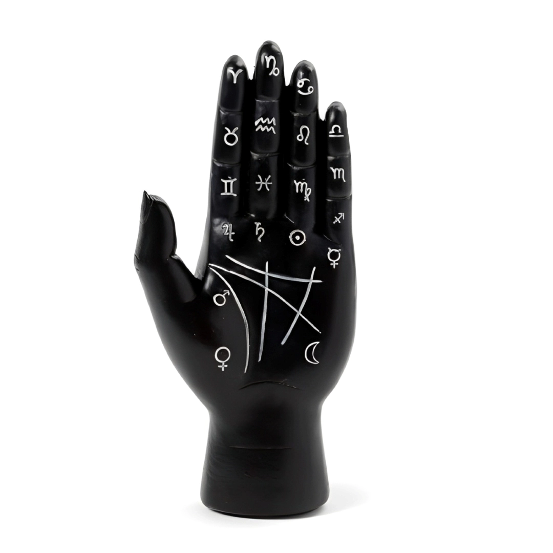 Mão de Quiromancia 15 cm indicada para estudo simbólico, orientação espiritual e decoração esotérica. Ideal para práticas de autoconhecimento.