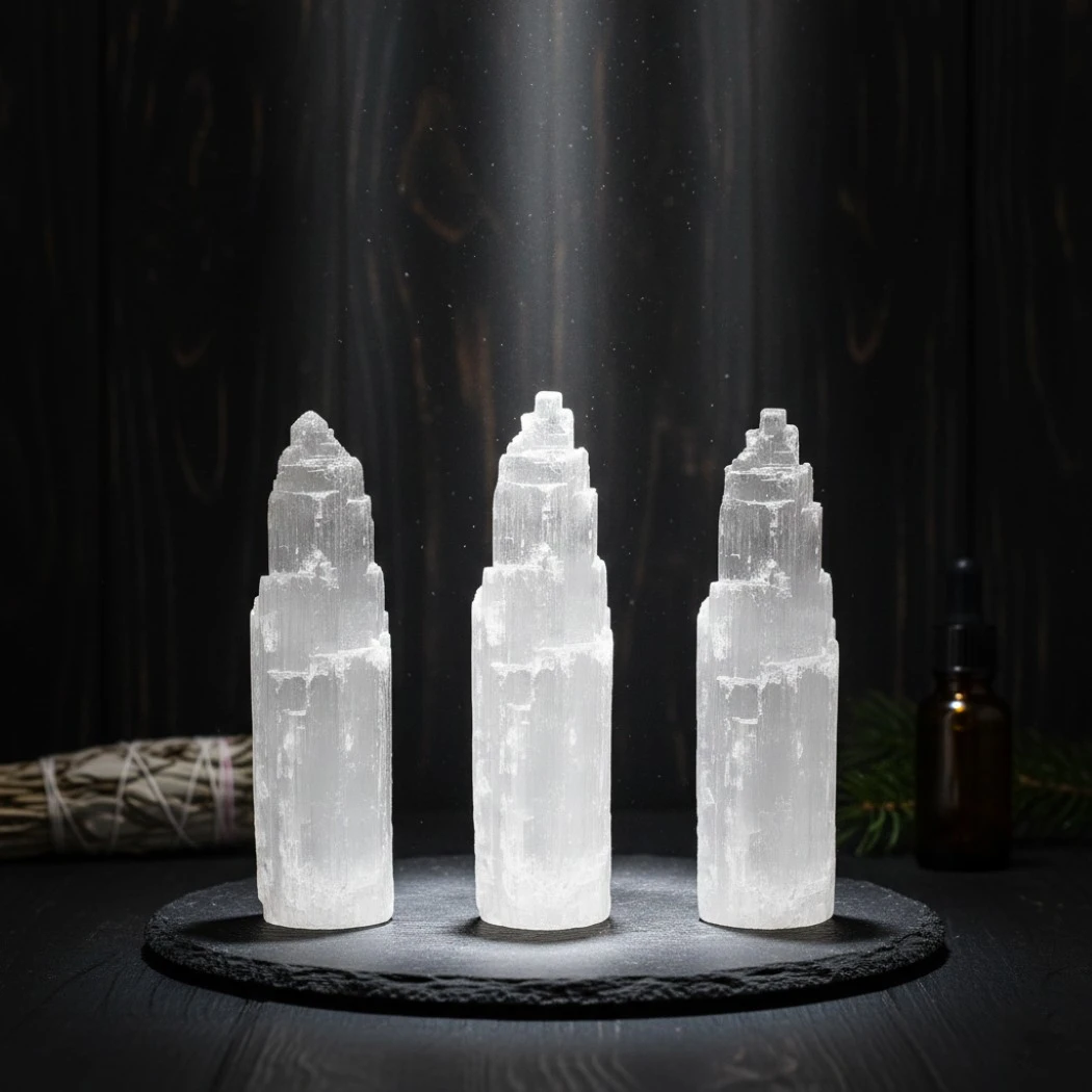A selenita é um cristal associado à clareza mental, serenidade e conexão espiritual. Sua energia pura e translúcida atua diretamente sobre o chakra coronário, fortalecendo a intuição e facilitando a comunicação com planos superiores.